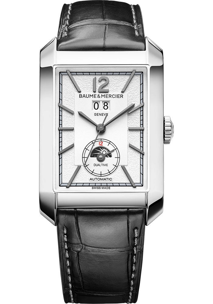 Baume & Mercier Hampton Automatic Watch - Dual Time - Big Date - 48 x 31 mm Steel Case - Silver Dial - Black Alligator Strap