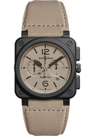 42 mm matt black ceramic case, sapphire crystal with anti-reflective coating, beige dial with superluminova-filled numerals, indices and hour and minutes hands, calibre br-cal.301 automatic movement with hours, minutes, small seconds at 3 o'clock, beige calfskin strap , includes additional ultra-resistant black synthetic fabric strap, black pvd coated steel pin buckle. Water resistant to 100 meters.
