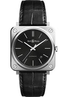 39 mm satin-polished steel case, sapphire crystal with anti-reflective coating, black dial with metal applique indices, calibre BR-CAL.302 automatic movement with hours, minutes, seconds and date, black alligator strap, satin-polished steel pin buckle. Water resistant to 100 metres.