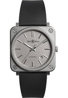 39 mm microblasted steel case, sapphire crystal with anti-reflective coating, grey dial with metal applique indices, calibre BR-CAL.302 automatic movement with hours, minutes, seconds and date, black rubber strap, microblasted steel pin buckle. Water resistant to 100 metres.