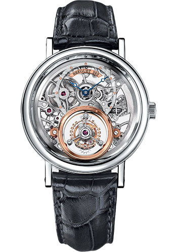 40mm platinum case, 9.65mm thick, transparent back, platinum bezel, scratch resistant sapphire crystal, skeleton dial with rose gold dot hour markers, calibre 558 SQ2 manual winding movement with off-centered hours & minutes, approximately 50 hours of power reserve, black alligator/crocodile leather strap, deployant buckle. Water resistant to 30 m (100ft).