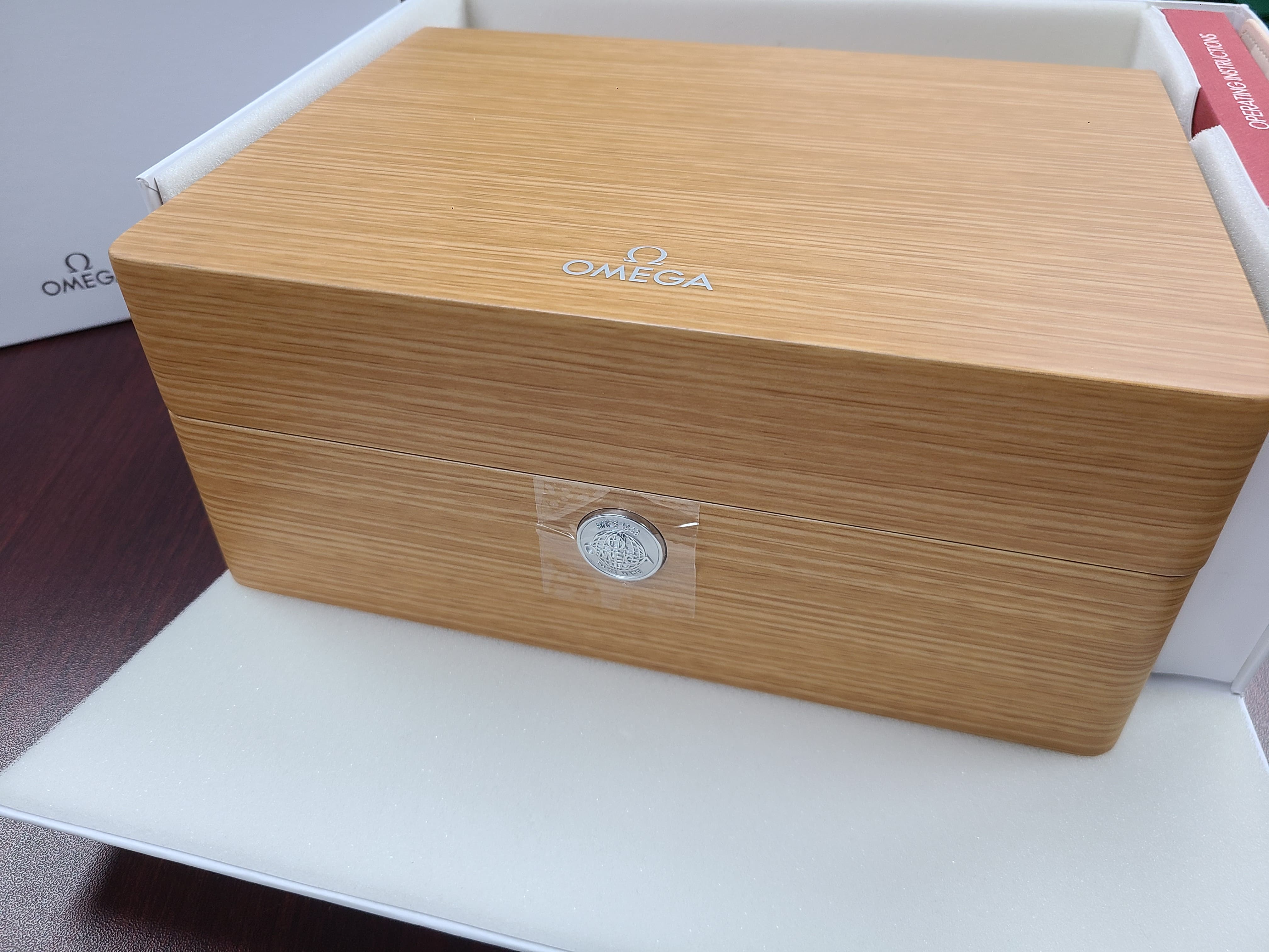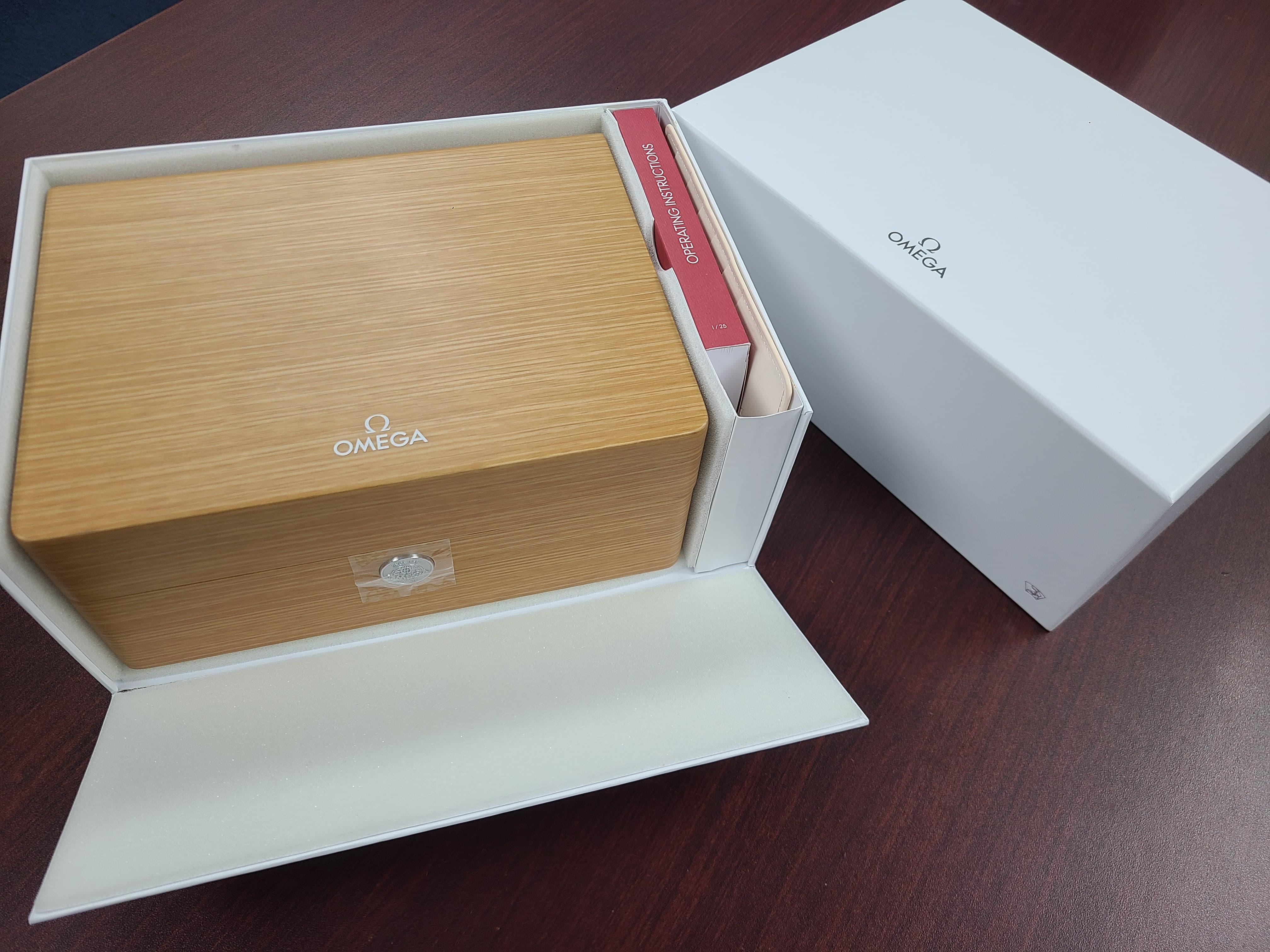 TRIPLE BOX/PAPERS : Omegas large wood box, outer cardboard, red travel leather case.
