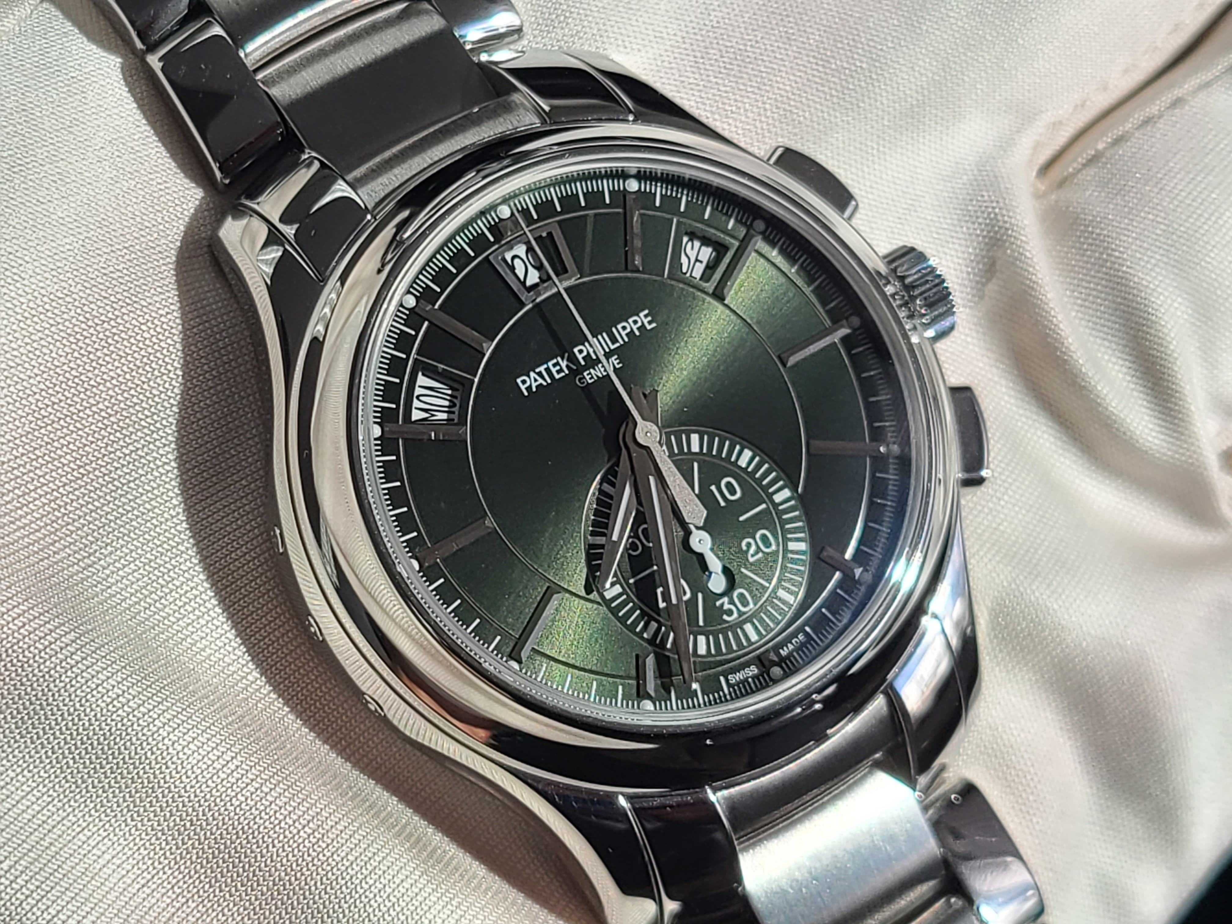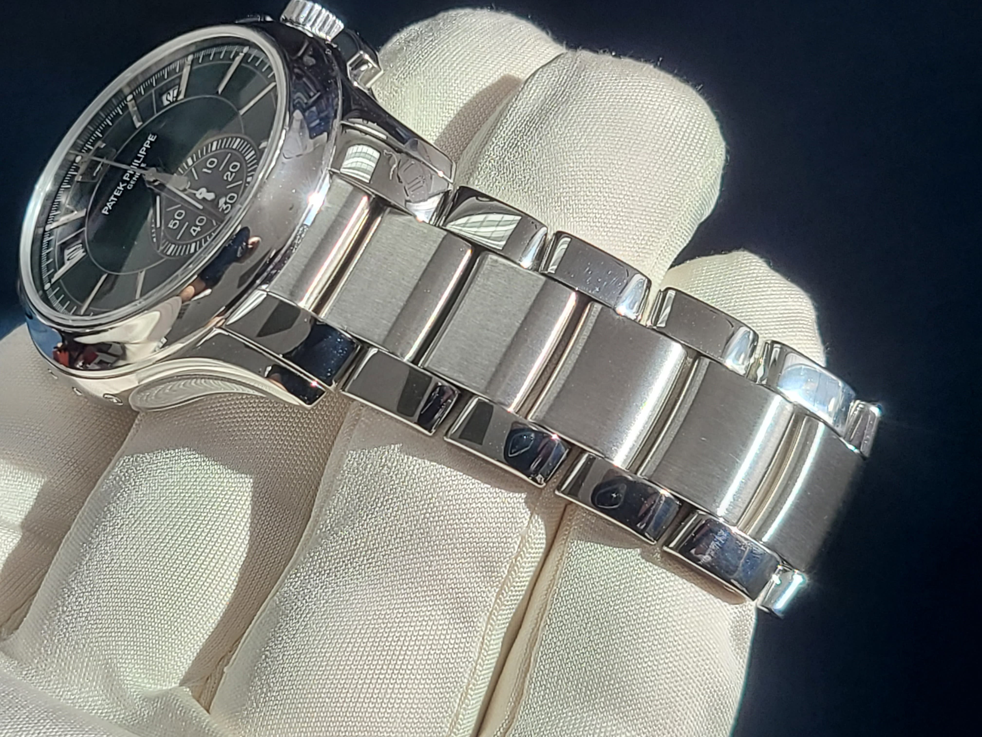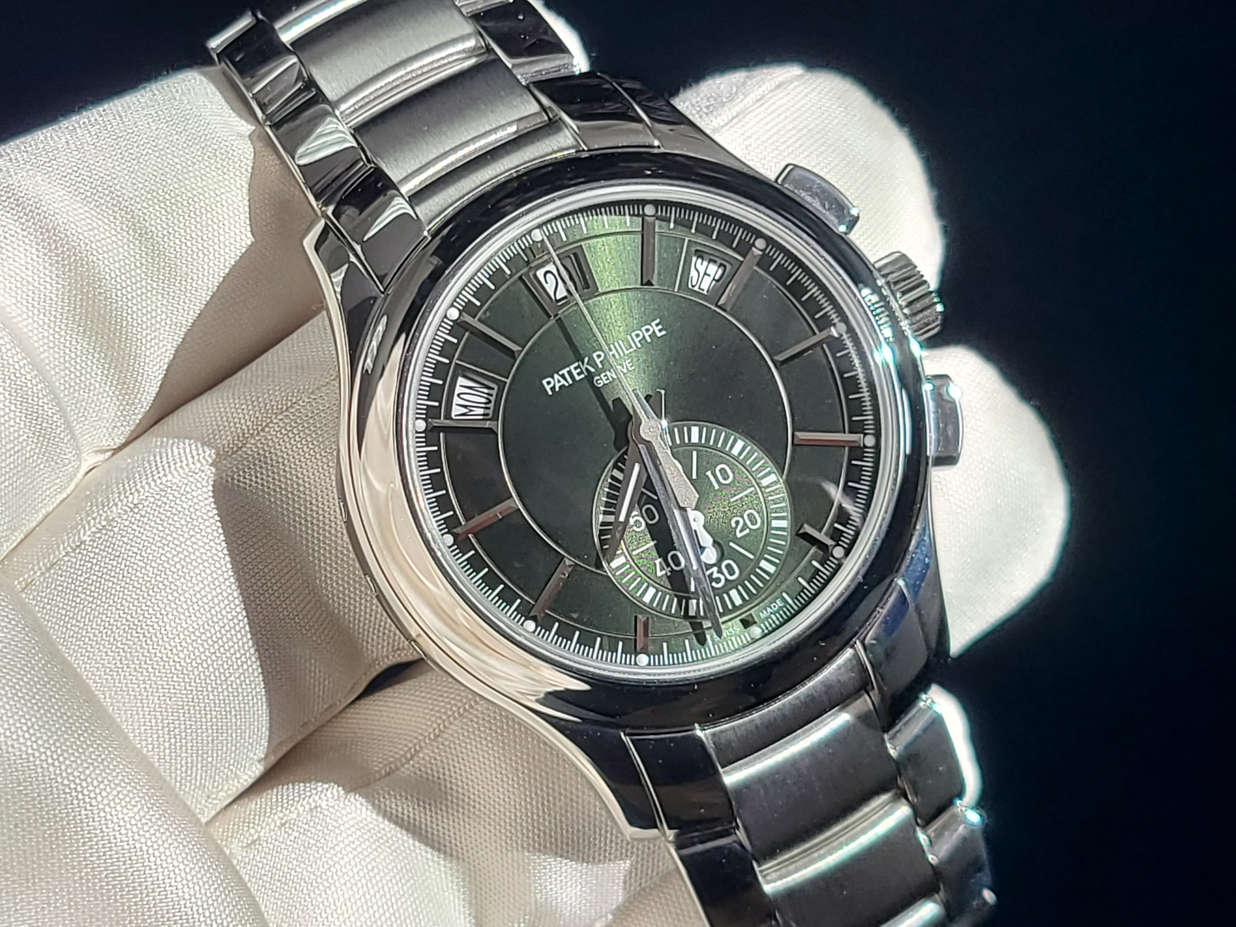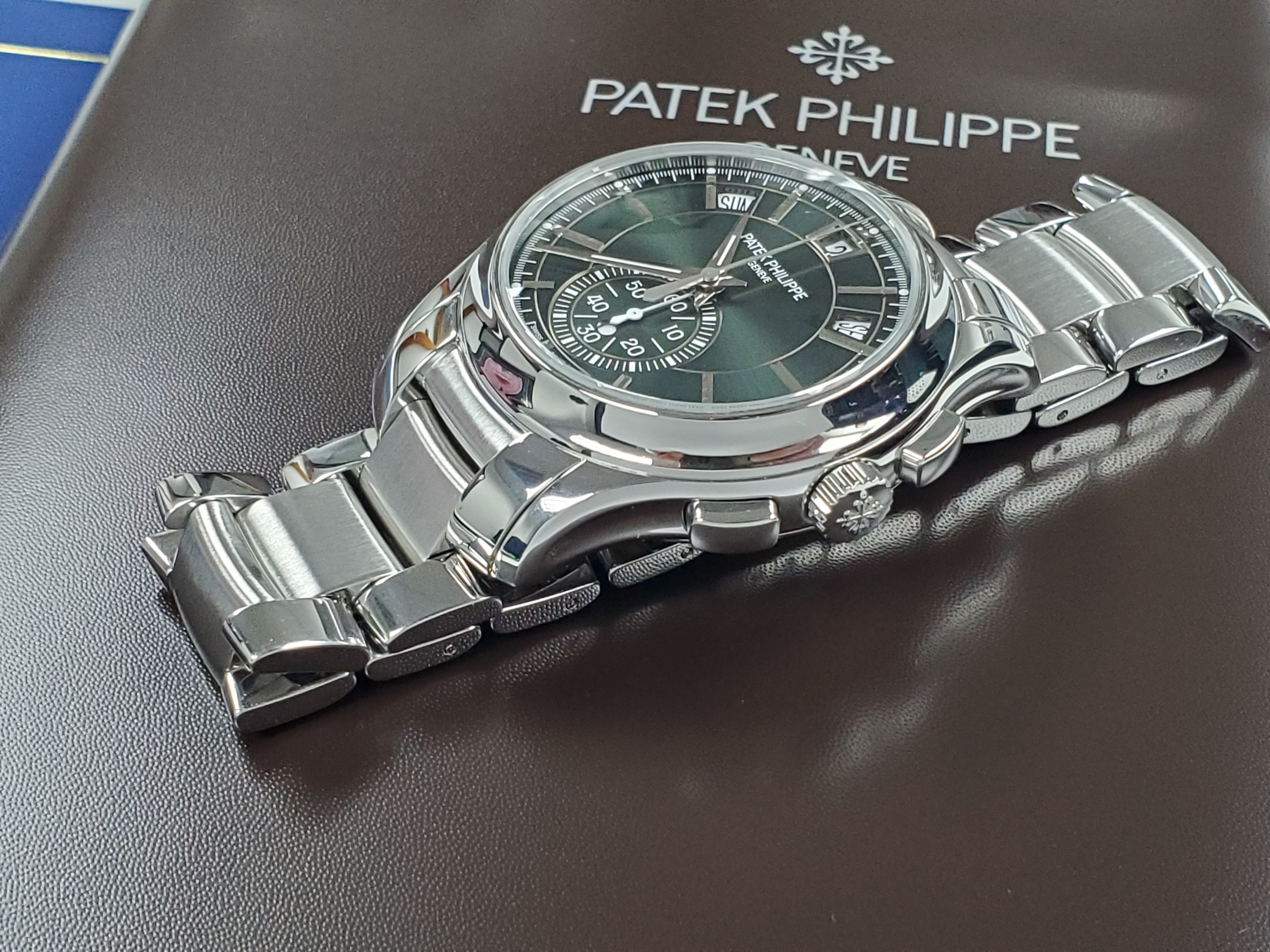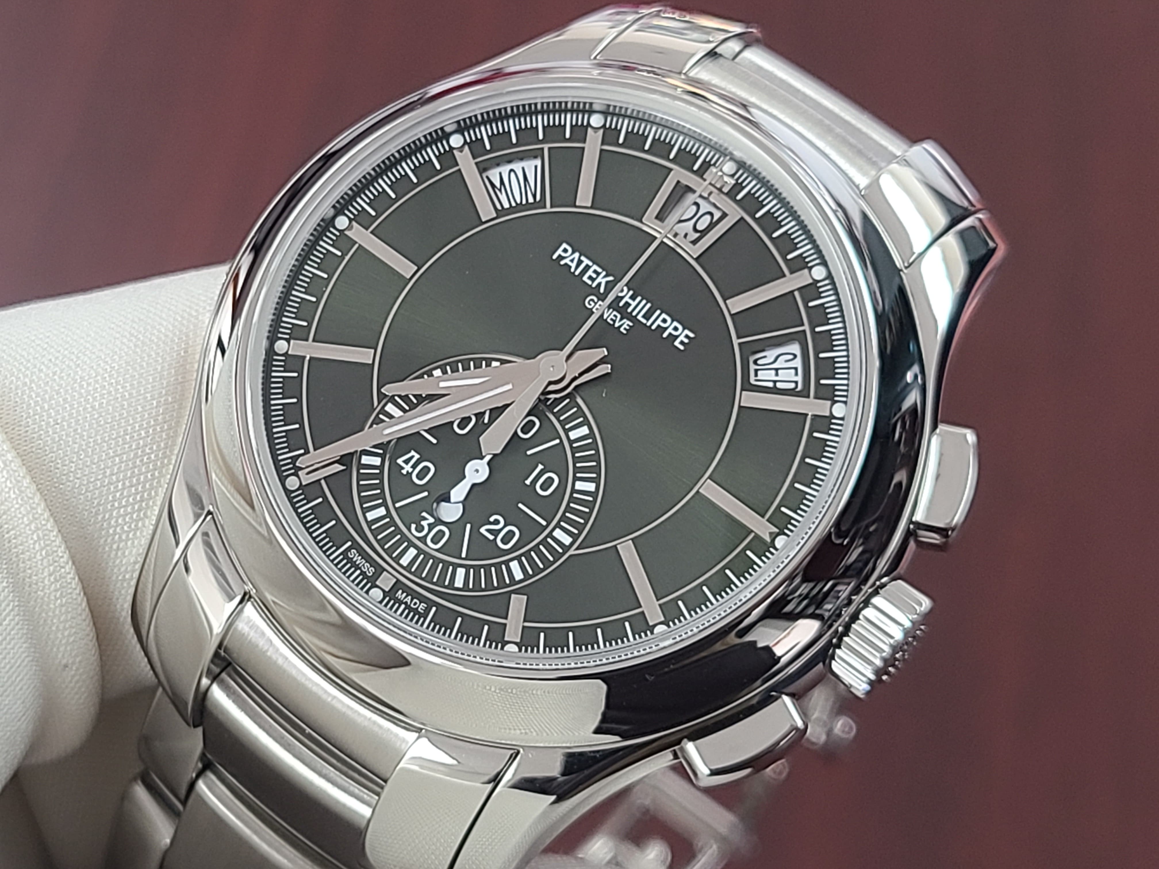 Patek Philippe PP 5905/1A-001 Annual Calendar Chronograph Flyback Day-Date-Month Complications Olive Green Dial Stainless Steel Mint Full Set
