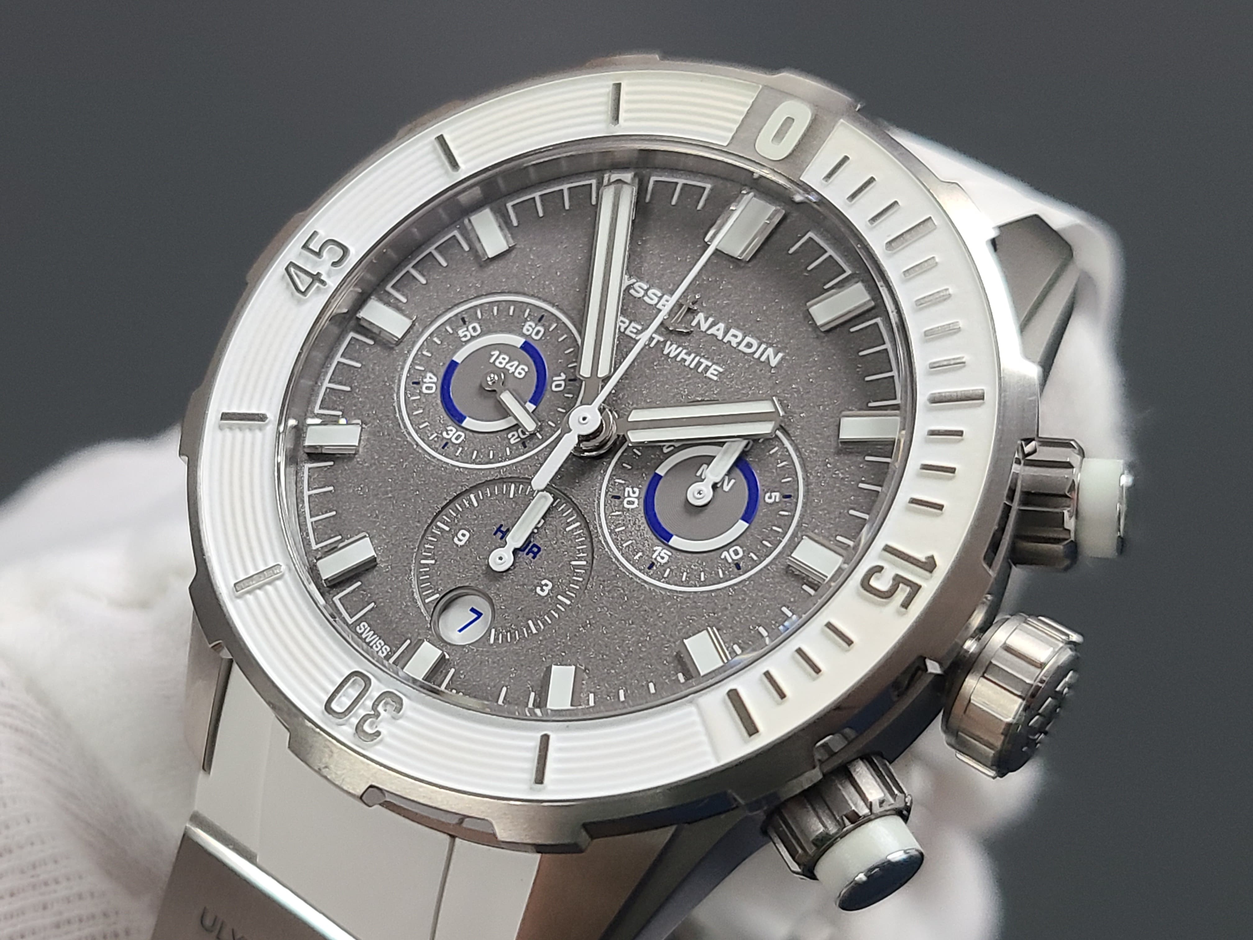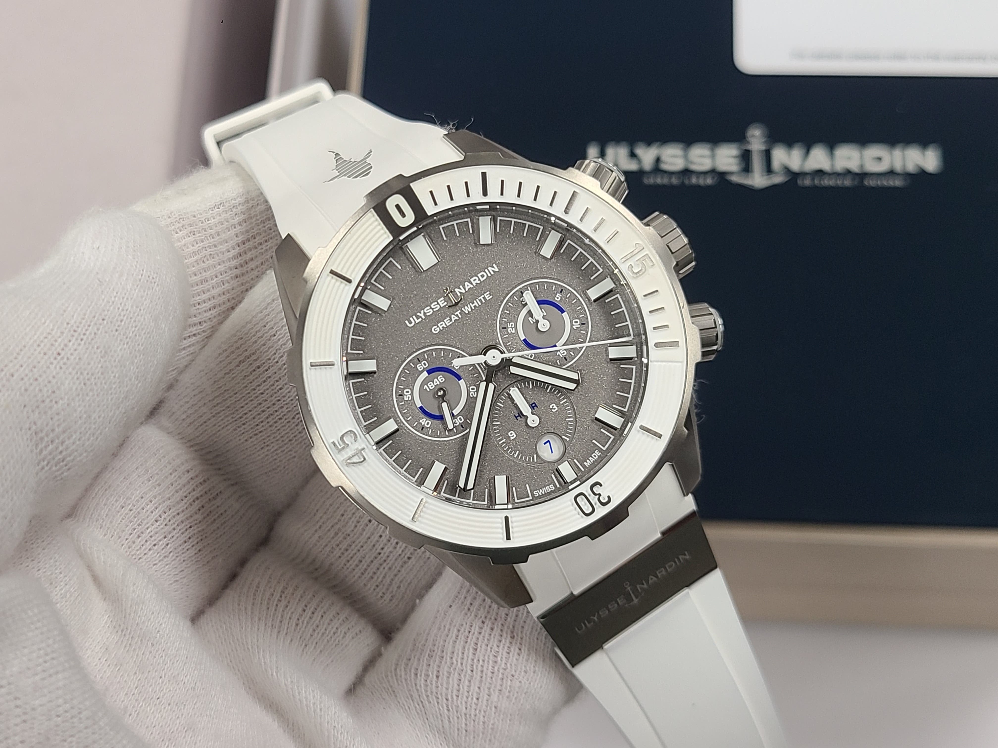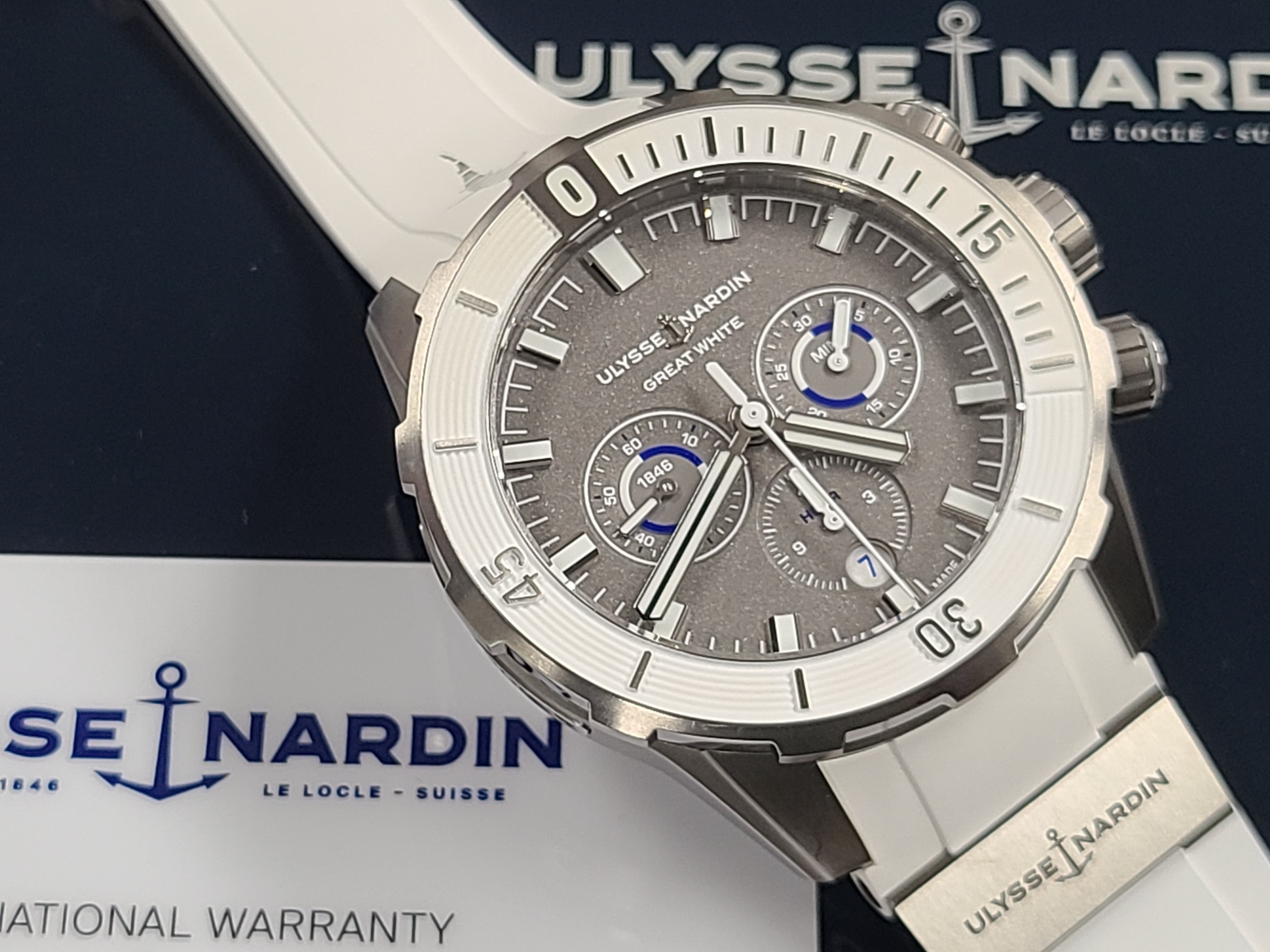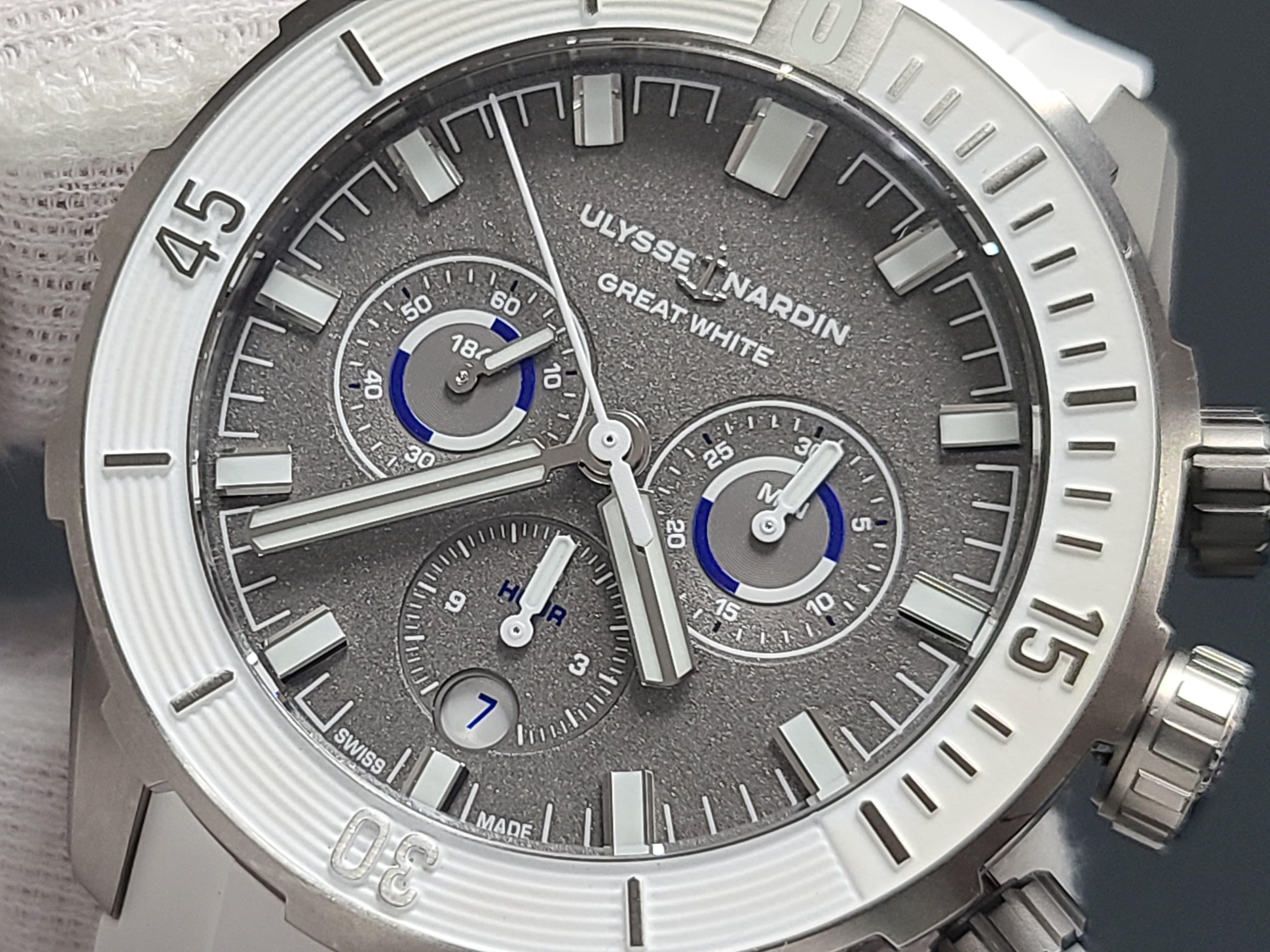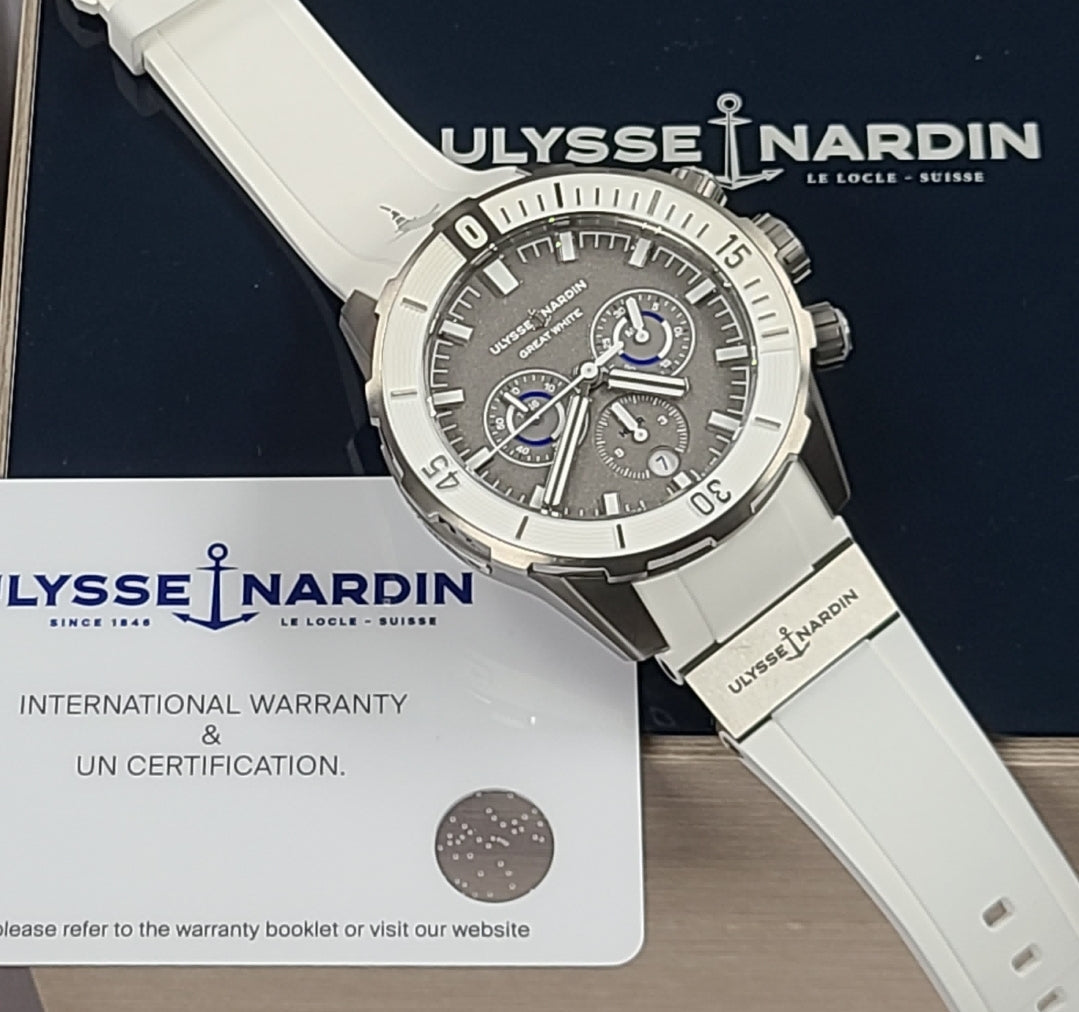 Ulysse Nardin Diver Chronograph Great White Shark Theme Colors Grey Titanium Sandblast Dial Rubber Strap Full Set Limited Edition 300 Pieces Only Certificate
