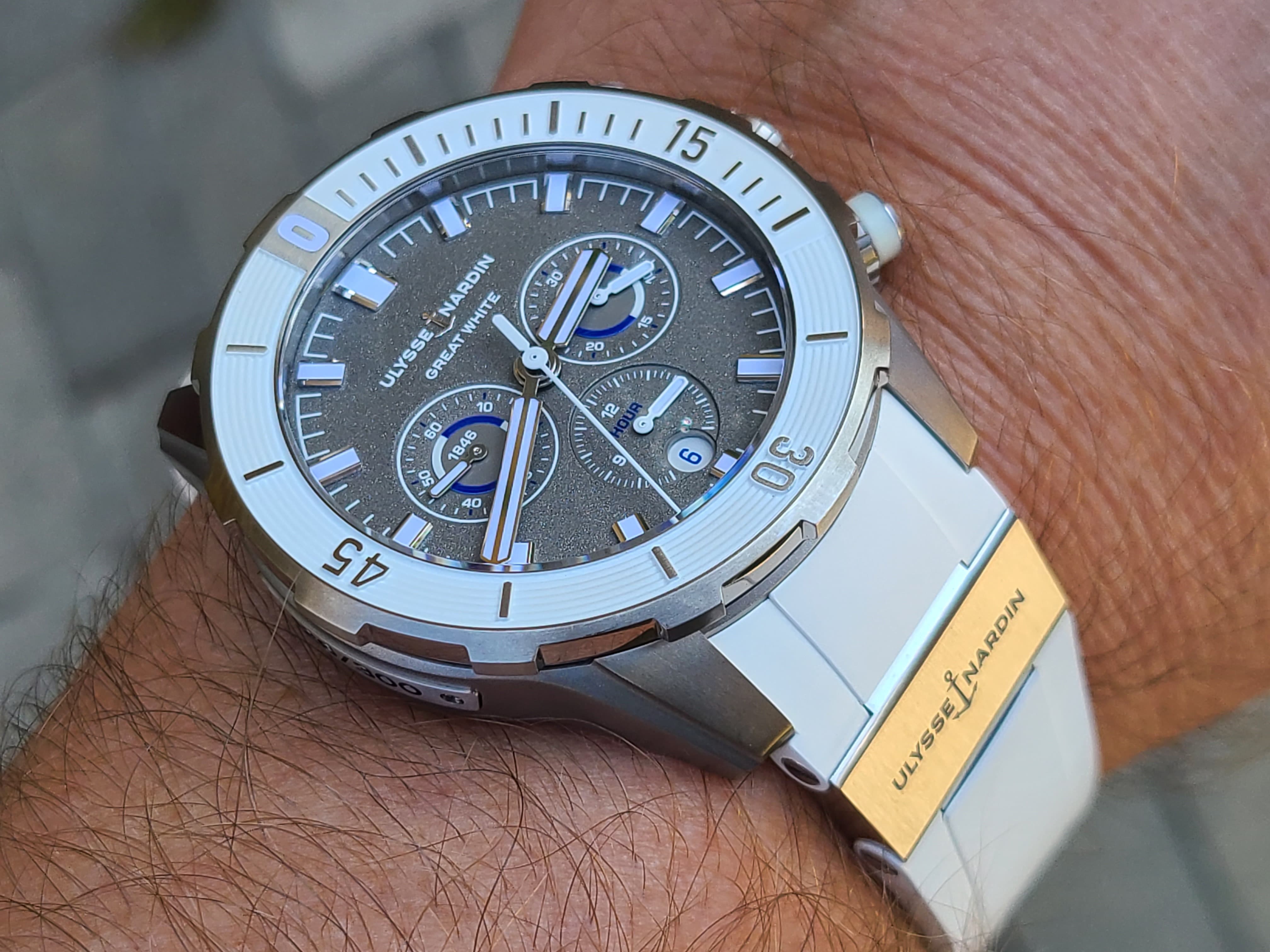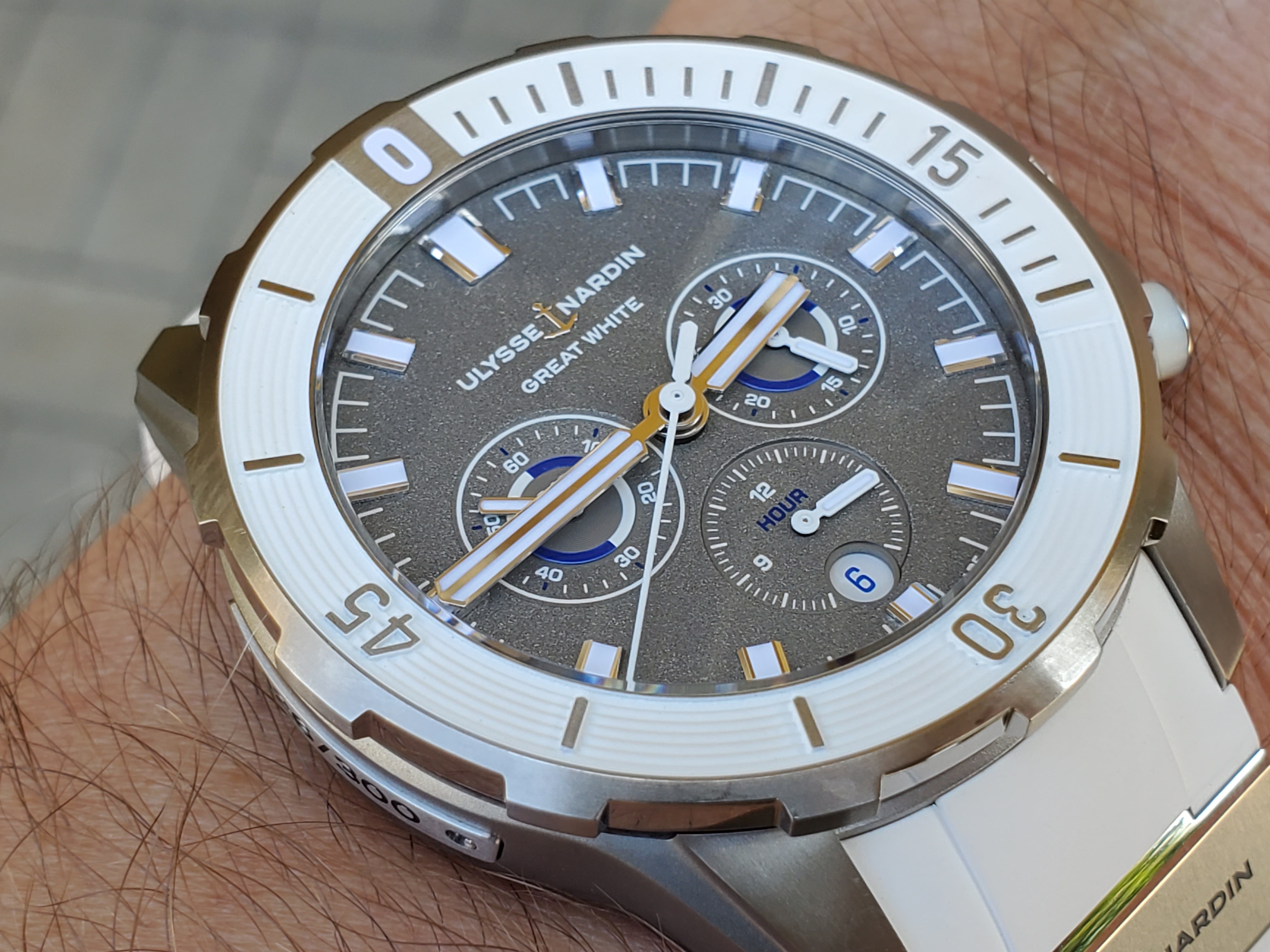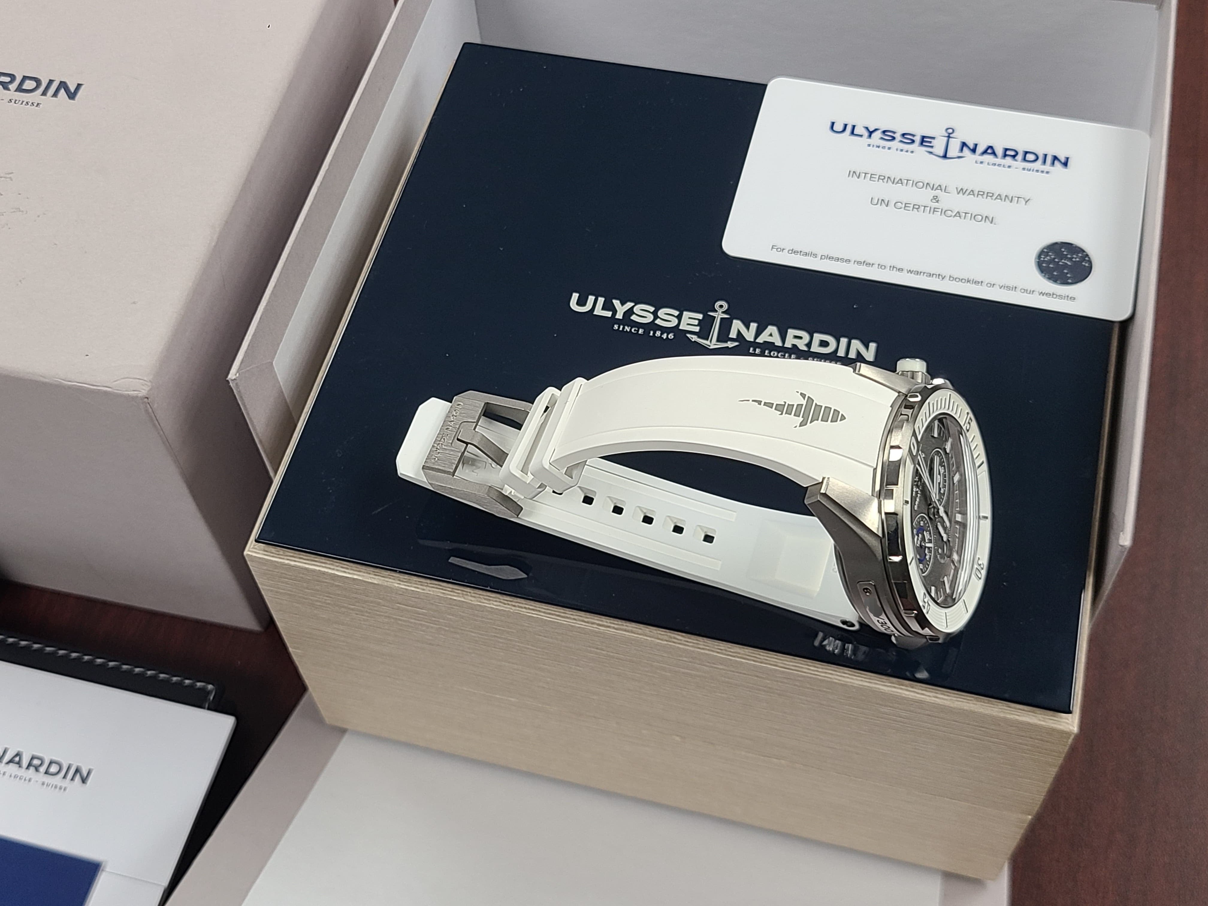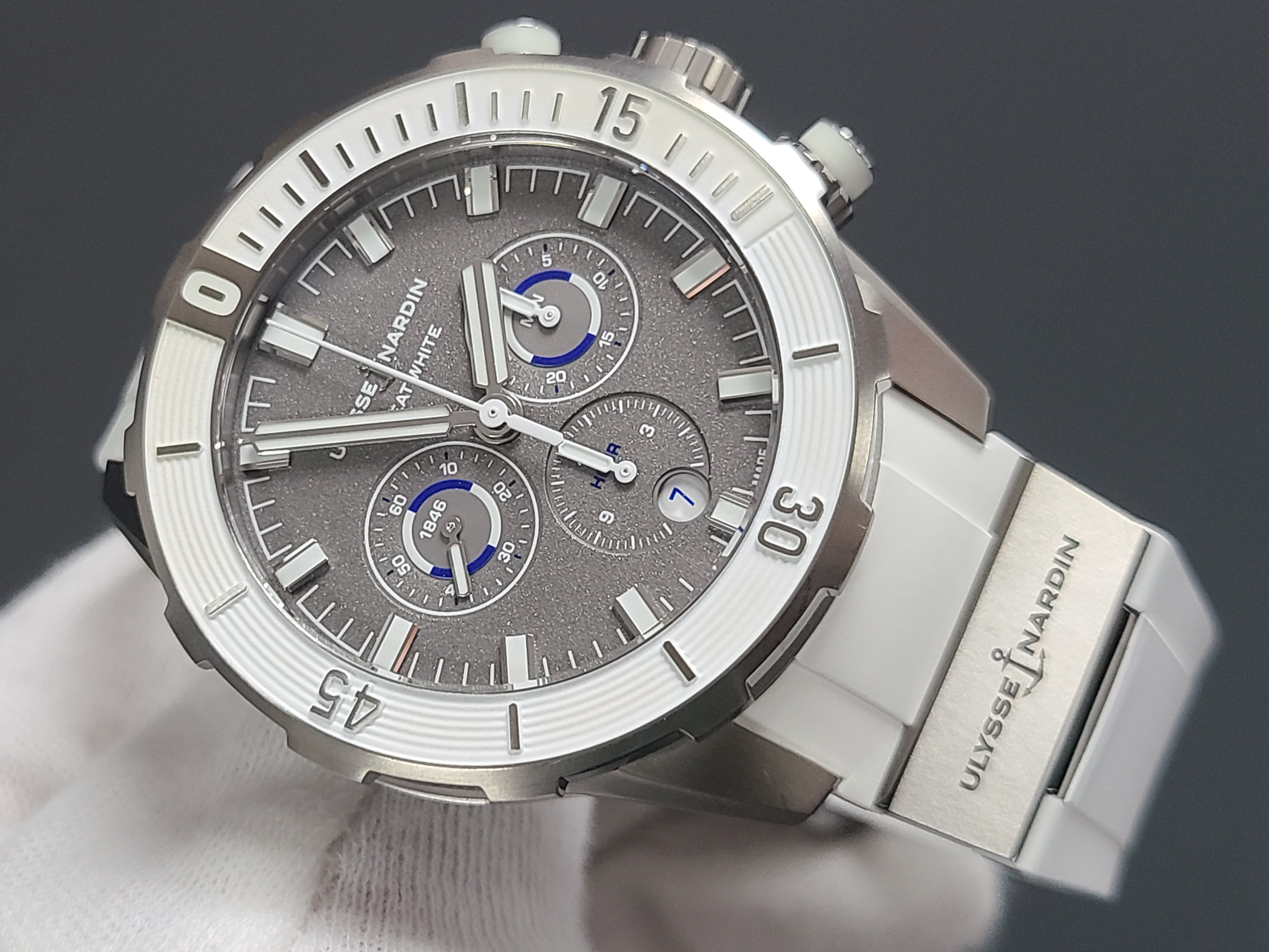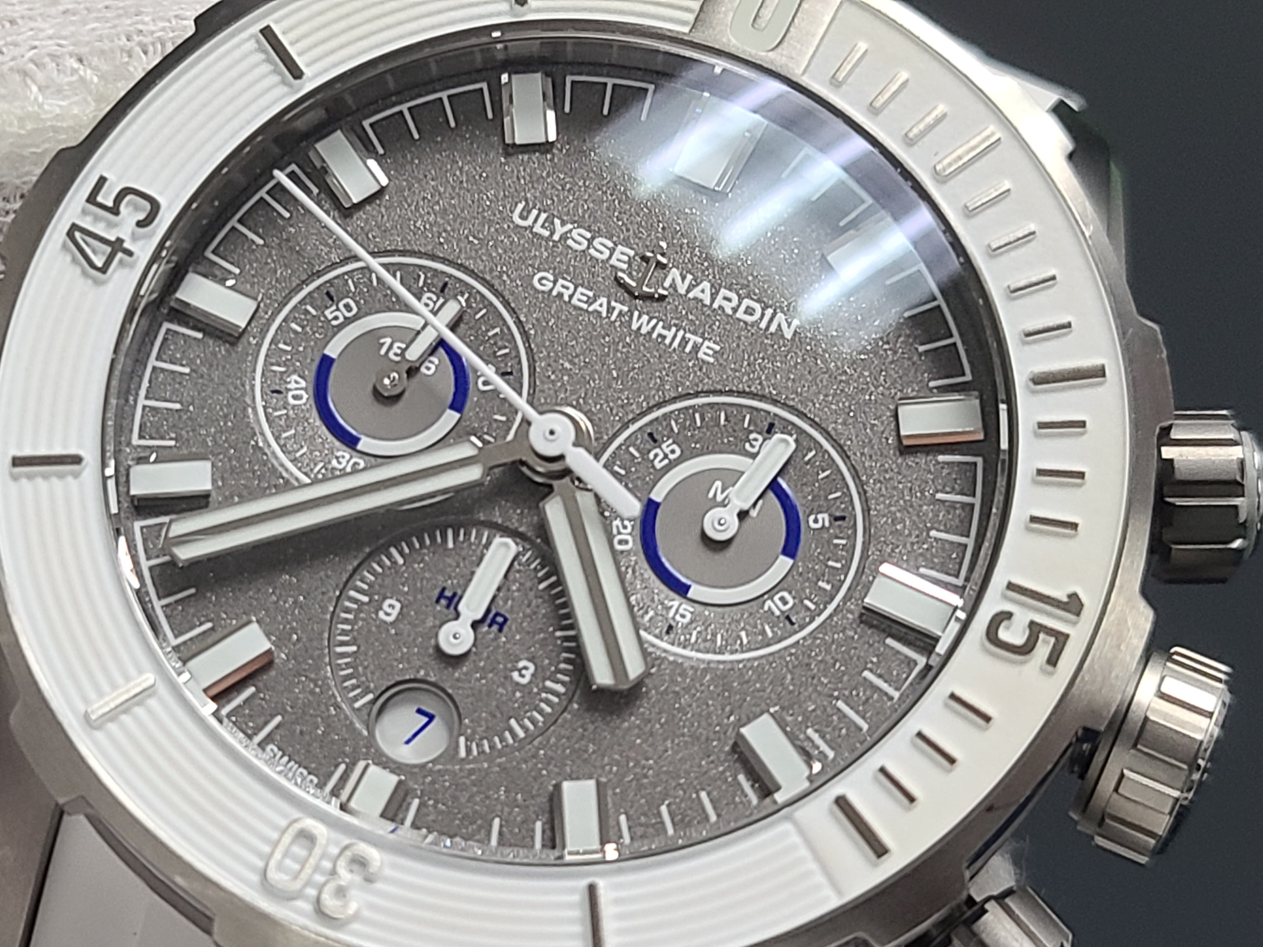 Ulysse Nardin Diver Chronograph Great White Shark Theme Colors Grey Titanium Sandblast Dial Rubber Strap Full Set Limited Edition 300 Pieces Only Certificate