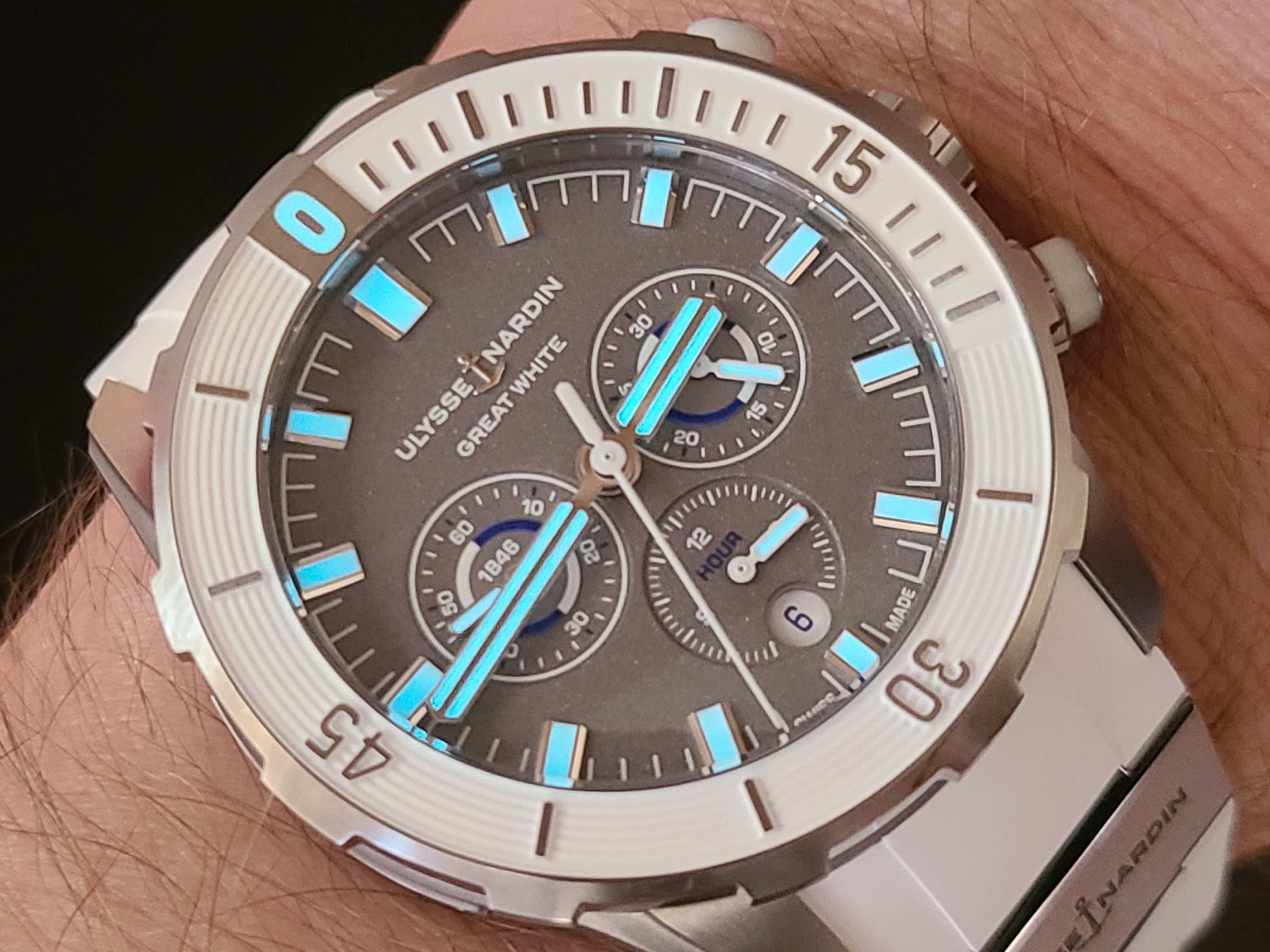 Bezel mark and shark on strap light up in dark.