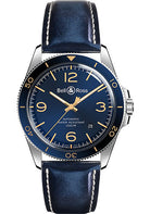 41 mm polished steel case, sapphire back, screw-down crown, rotating steel bezel with anodised blue aluminium ring and 60-minute scale, ultra-curved sapphire crystal with anti-reflective coating, blue sunray dial with gilt applique hour markers, calibre BR-CAL.302 automatic movement with hours, minutes, central seconds and date, black calfskin strap, satin-polished steel folding buckle. Water resistant to 100 metres.