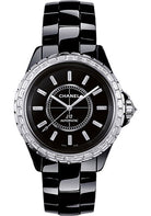 38mm 18K white gold and black high-tech ceramic case, 18K white gold bezel set with 34 baguette cut diamonds (approx. 2.54 carats), black dial with 12 baguette cut diamond indicators, self-winding movement with hours, minutes, seconds, approximately 42 hours of power reserve, ceramic bracelet, triple-folding buckle in 18K white gold. Water resistant to 50 metres.