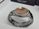 Set with 46 diamonds bezel. Pink powder dial with 8 diamond index hour markers. Arabic numerals mark the 3, 6, 9 and 12 o'clock positions. minute markers around an inner ring.