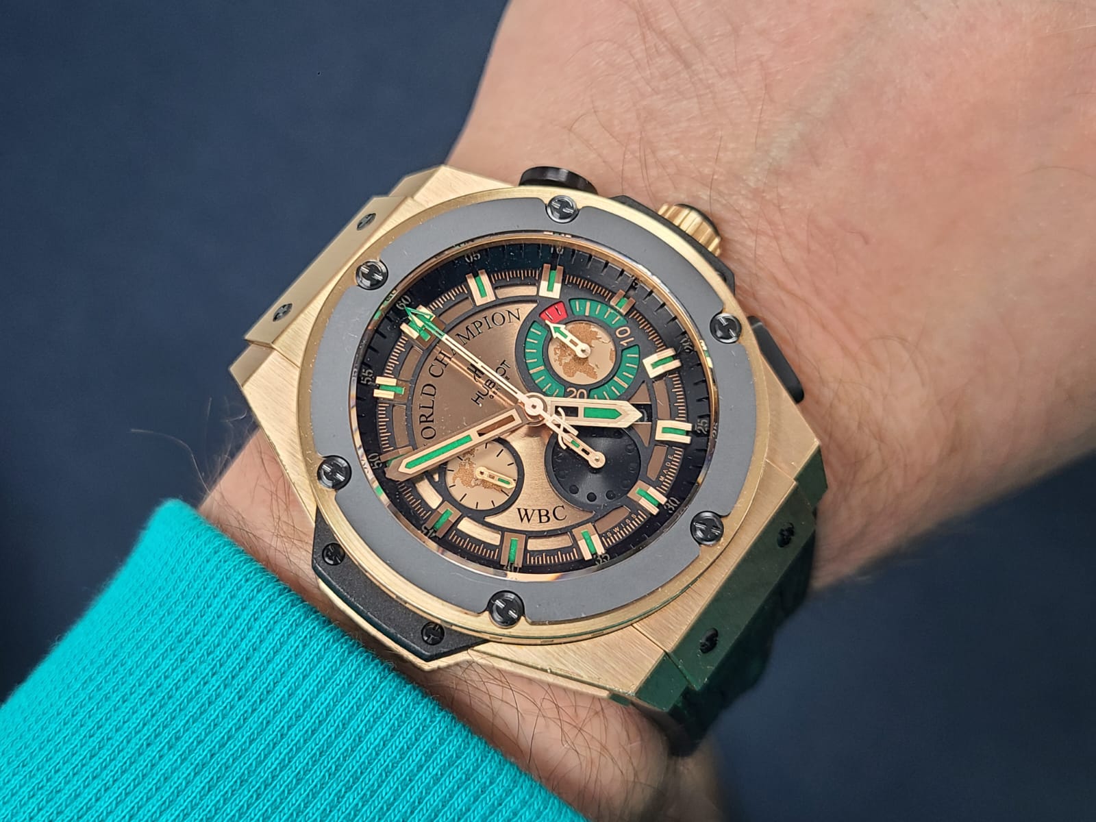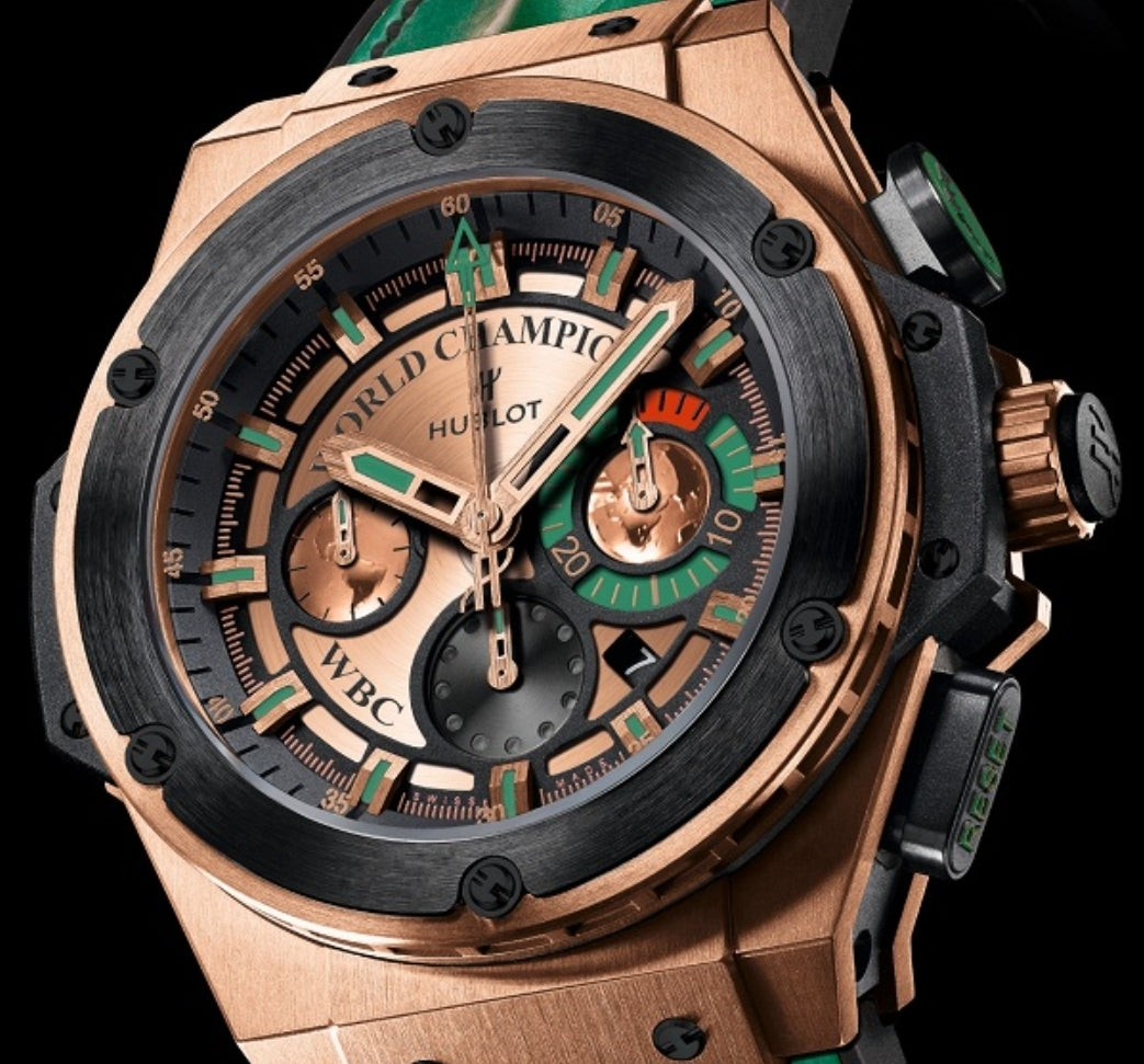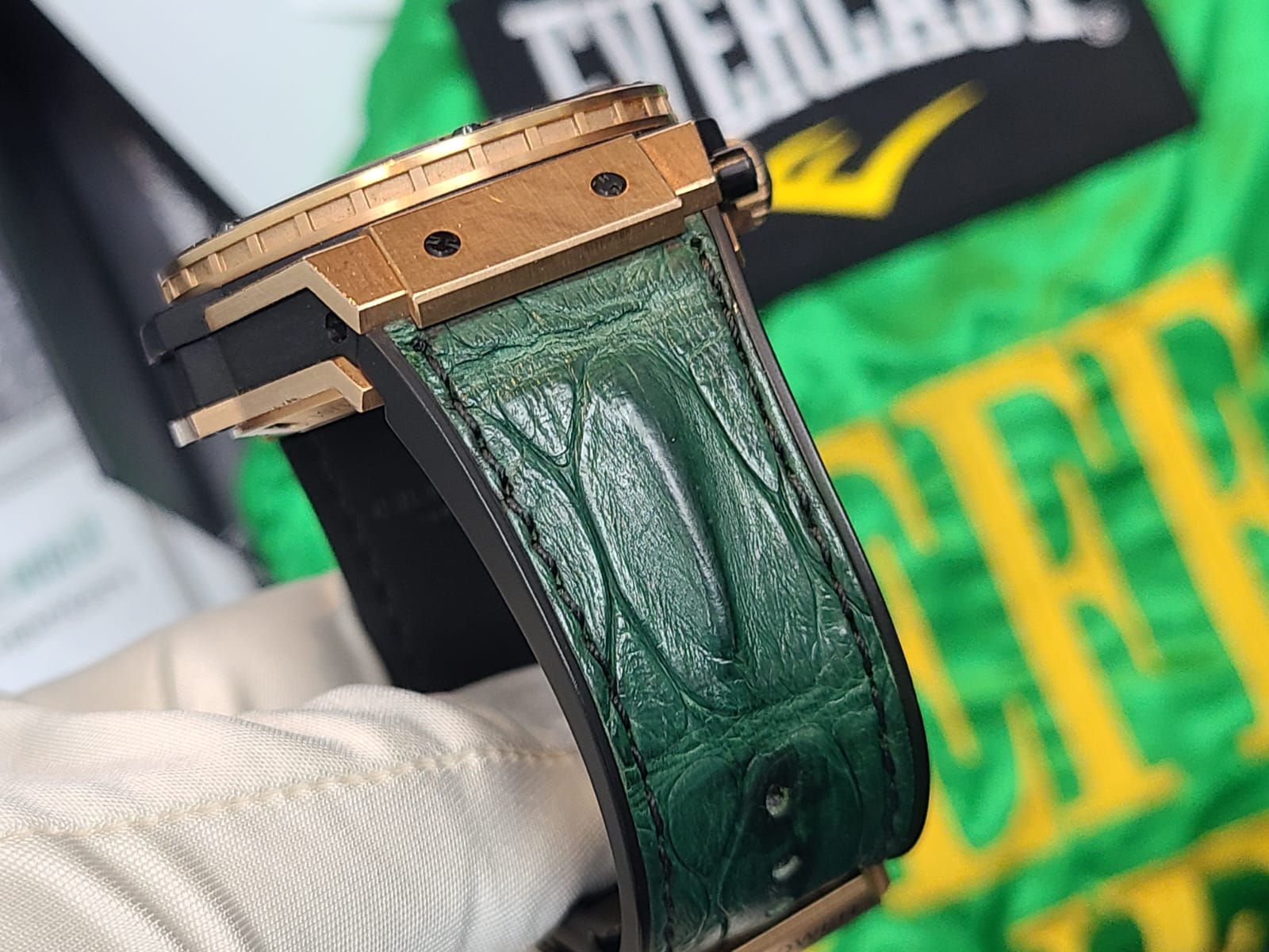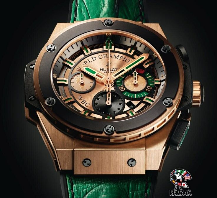 DIAL: Gilt dial, baton markers, green lumes. Green and gold tones are meant to match the WBC belt that is given to the best fighters.