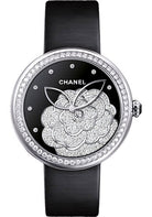 37.5 mm 18K white gold case set with 60 brilliant-cut diamonds - 1K, onyx cabochon crown, diamond bezel, black dial with an 18K white gold camellia set with 278 brilliant-cut diamonds and 7 brilliant-cut diamond indicators - 0.9K, self-winding movement, approximately 42 hour of power reserve, black satin strap, 18K white gold buckle set with 80 brilliant-cut diamonds - 0.49K. Water resistant to 30 meters.