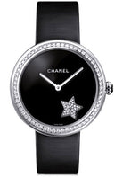 37.5mm 18K white gold case, onyx cabochon crown, 18K white gold bezel set with 60 brilliant-cut diamonds. (~1.09 carats), black dial with whirling titanium comet motif, 31 brilliant-cut diamonds, self-winding movement with hours, minutes, approximately 42 hours of power reserve, black satin strap, ardillon buckle in white gold.