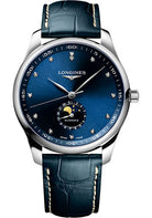 Longines Master Collection Moon Phase Automatic Watch - 42 mm Steel Case - Blue Diamond Dial - Blue Alligator Leather Strap - L2.919.4.97.0